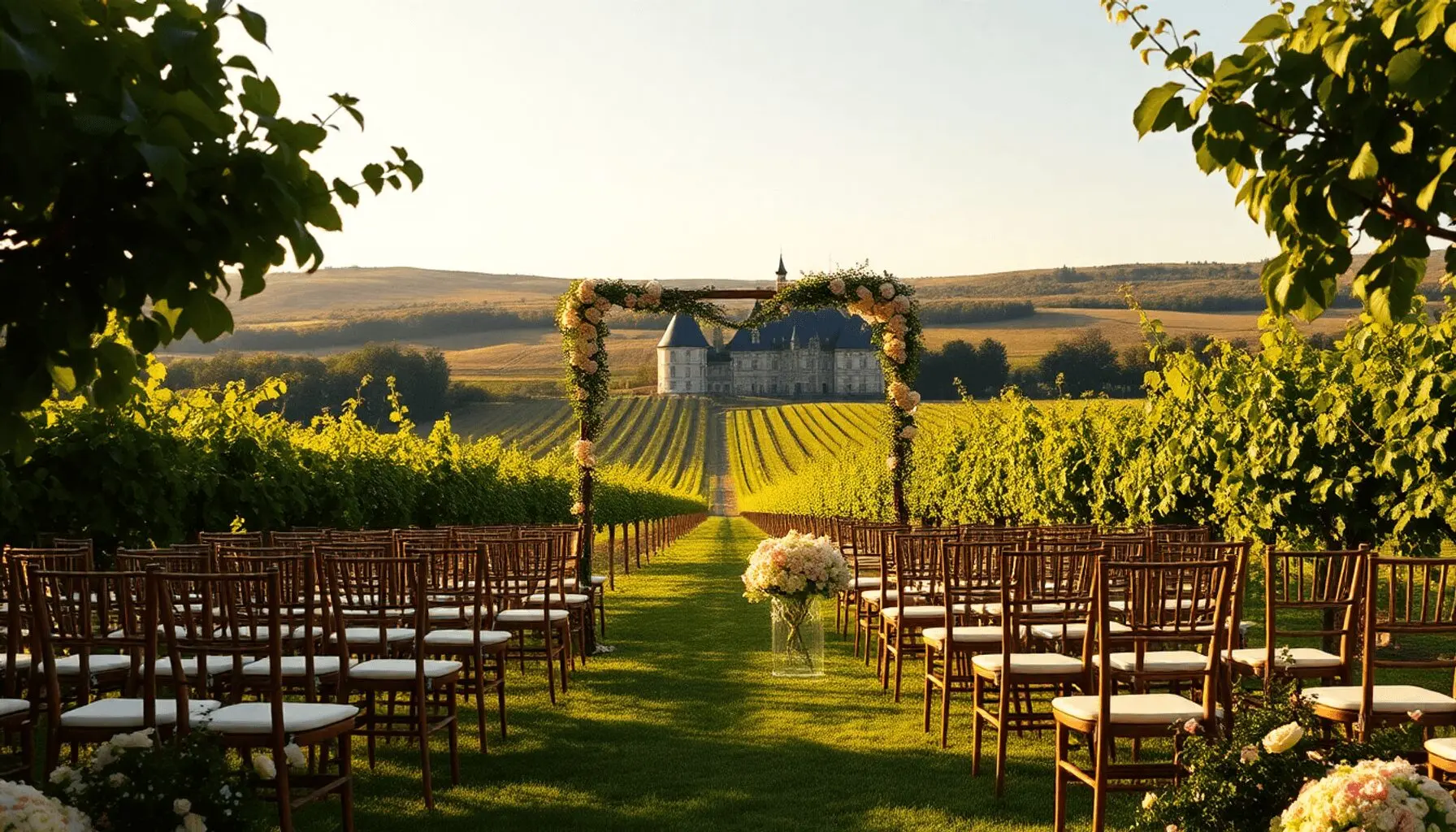 Vavril's vineyard landscape does the heavy lifting when it comes to wedding décor Beaujolais style. The rolling vines, historic château architecture, and golden-hour lighting create an atmosphere that requires minimal enhancement. You'll want to let these natural elements shine rather than competing with them through excessive decoration.