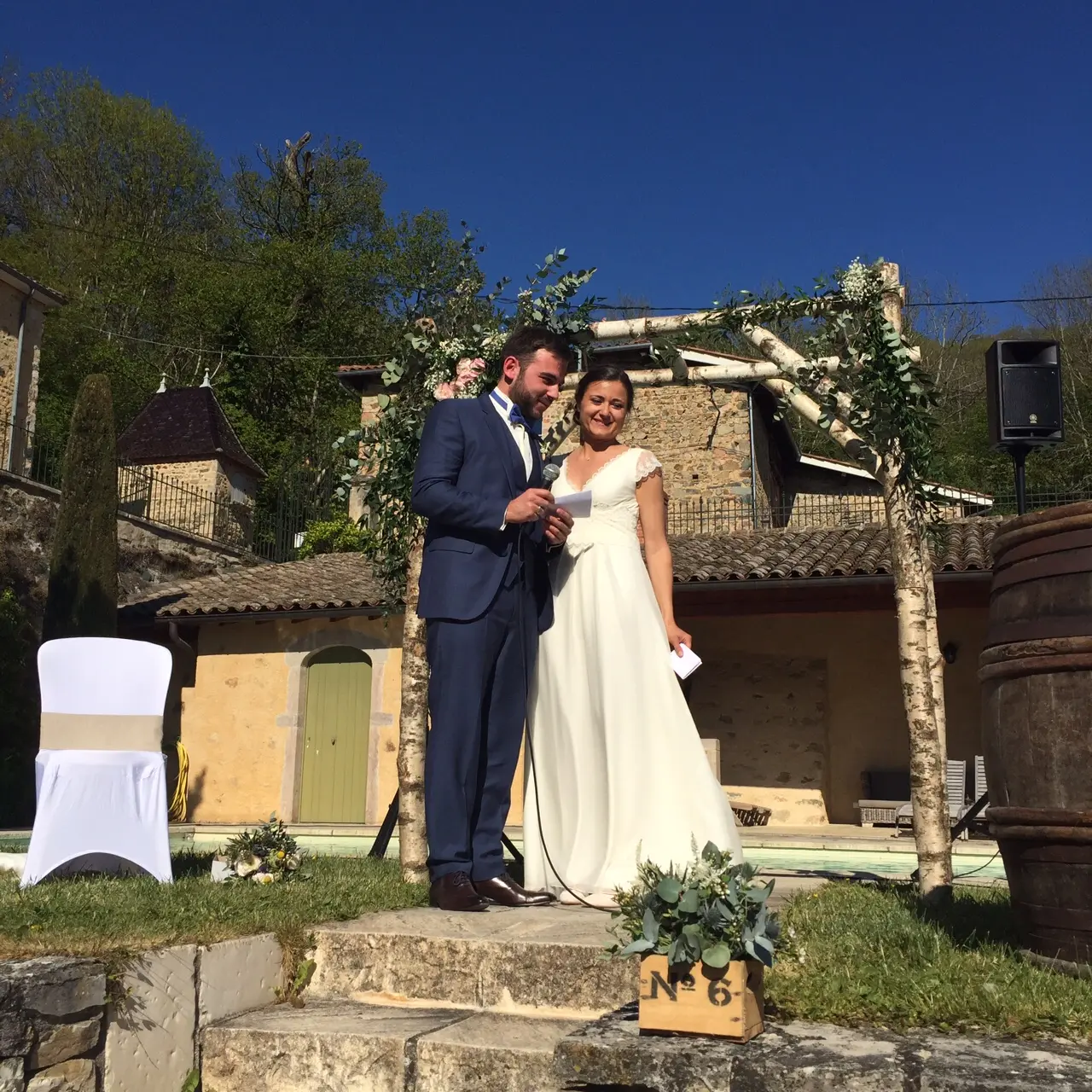 « Tout a été parfait ! La météo (plutôt inespérée), le lieu, nos préparatifs respectifs dans la maison, notre cérémonie laïque autour de la fontaine (d’une intensité et d’une émotion que nous n’avions pas imaginées), les surprises de nos proches, un lâcher de lanterne réussi, une piste remplie durant toute la soirée dansante, et j’en passe tant nous avons de souvenirs magnifiques en mémoire… »